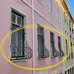 Window grills with a curved bottom are typically designed to hold flower boxes or small planters securely. The curved shape provides stability for pots, allows space for plants, and adds a decorative element, enhancing both the functionality and aesthetic appeal of the building’s exterior.